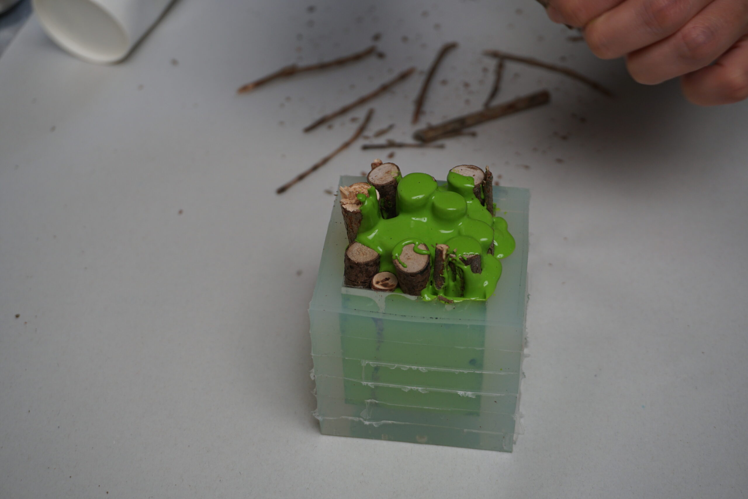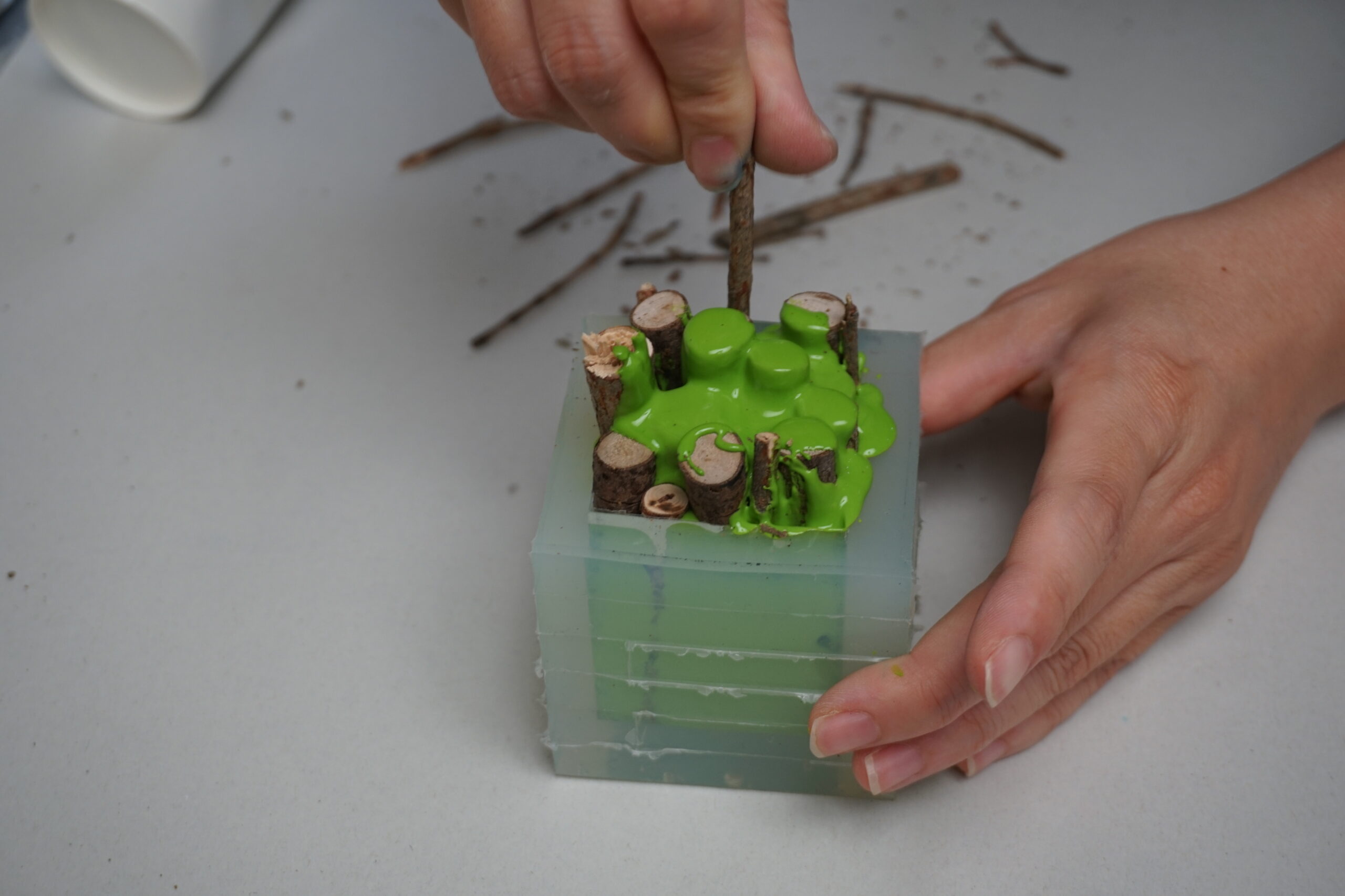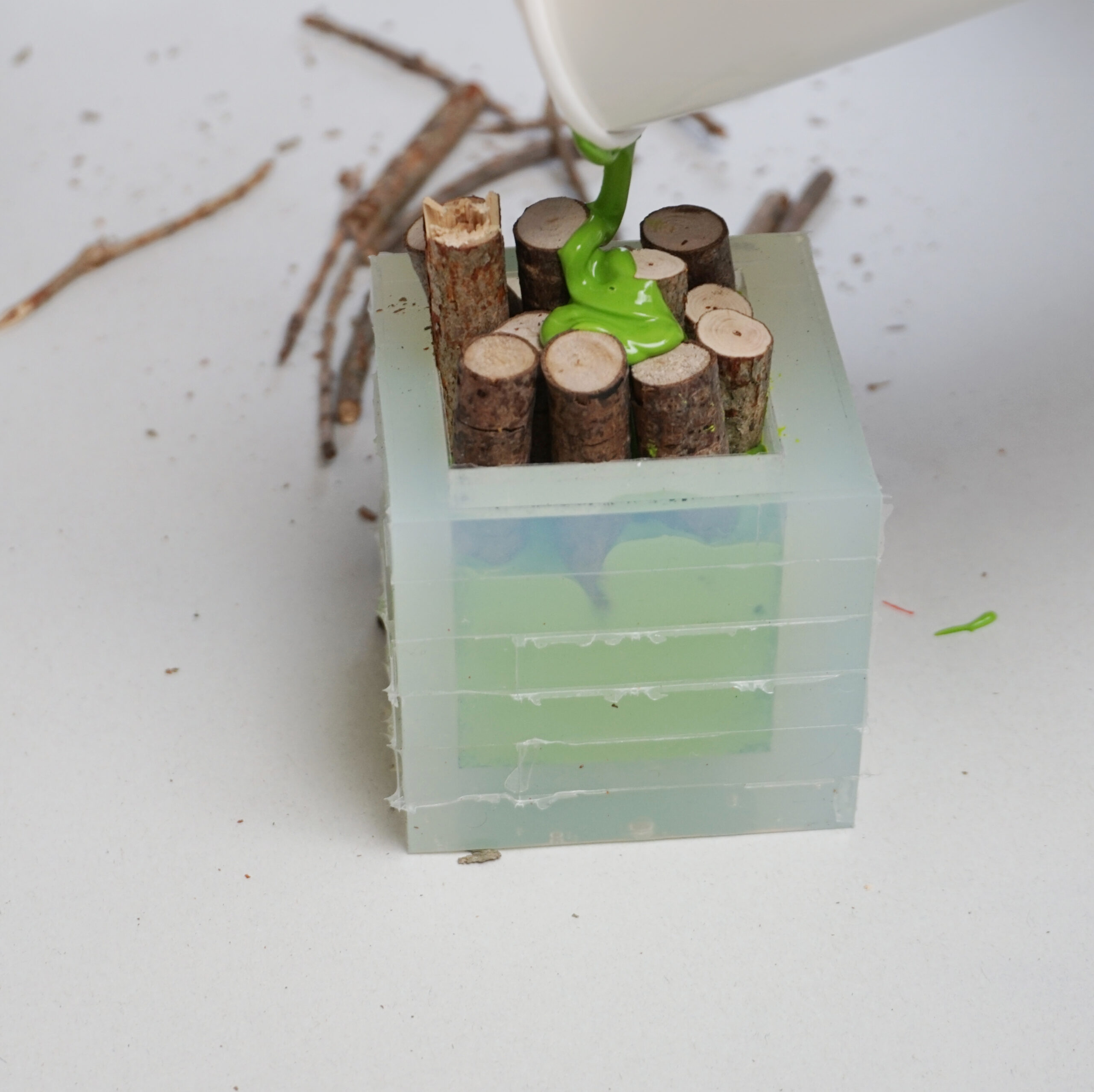 3.いったん枝を取り出し、型の4/1くらいまで着色したAC100を流し込んでおきます。