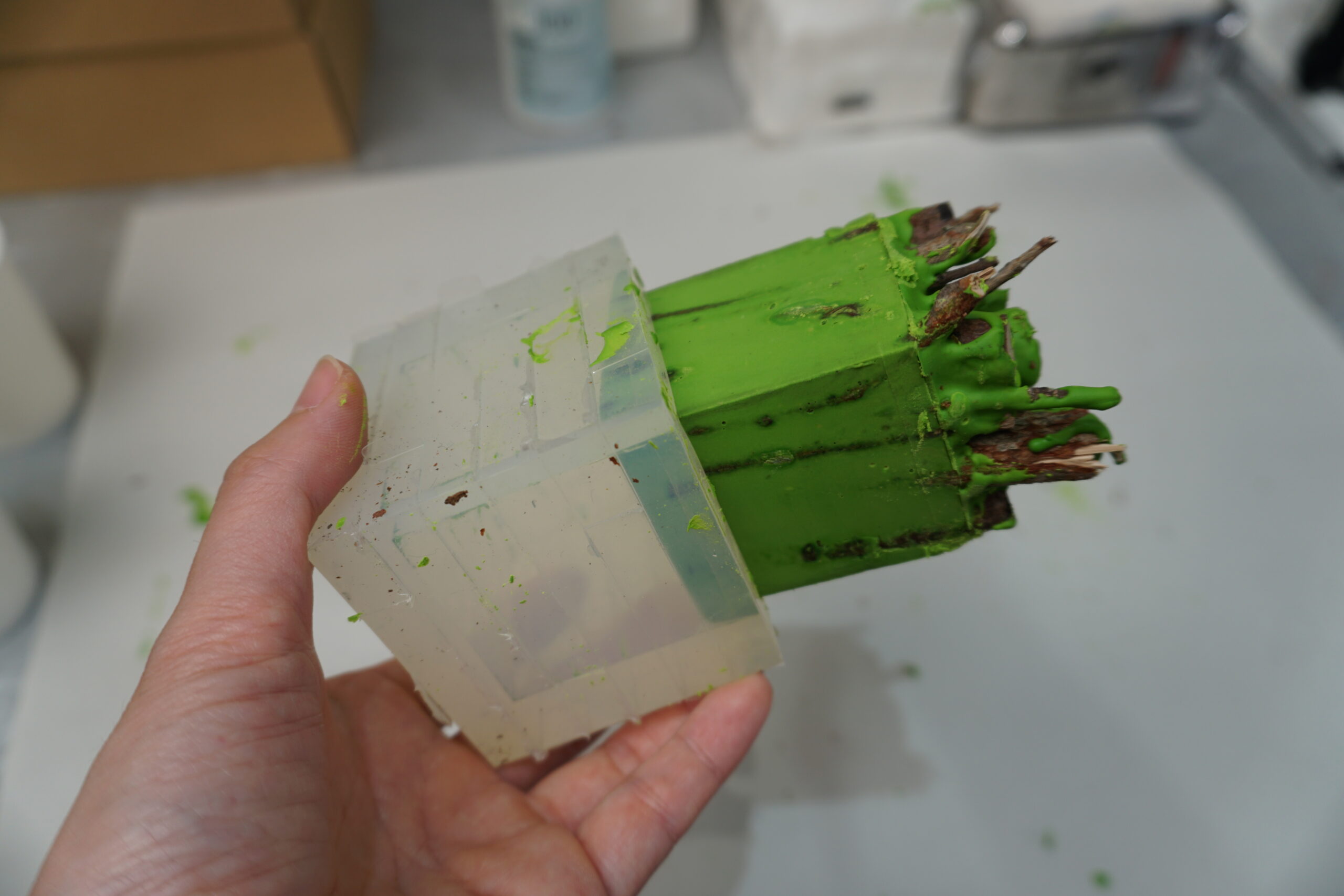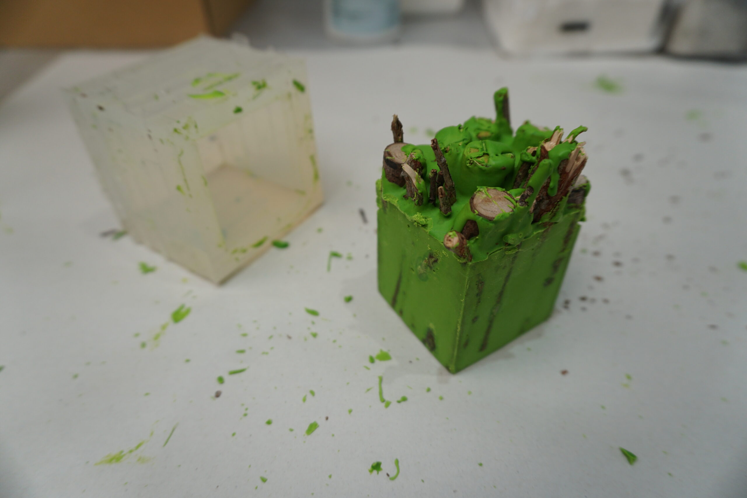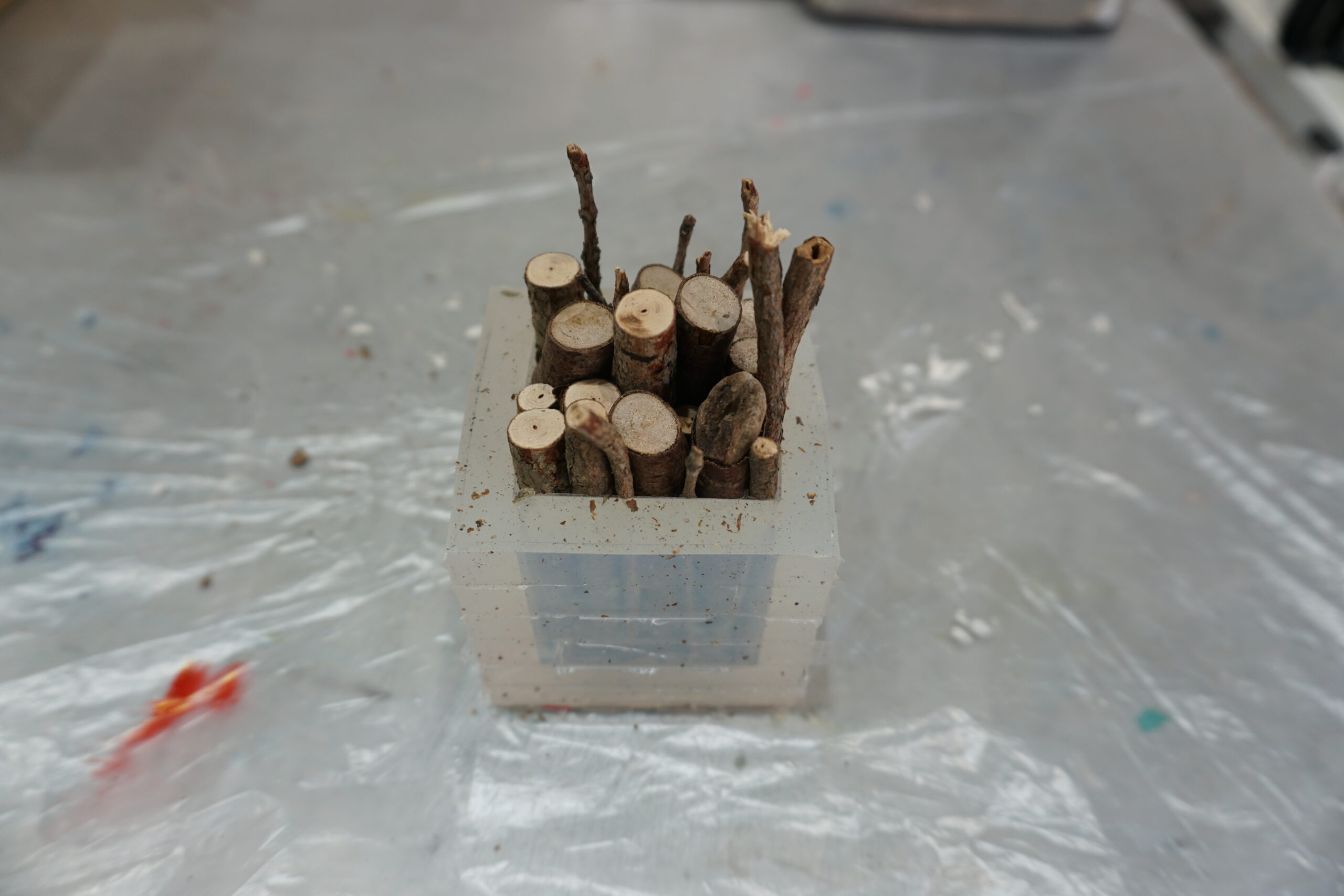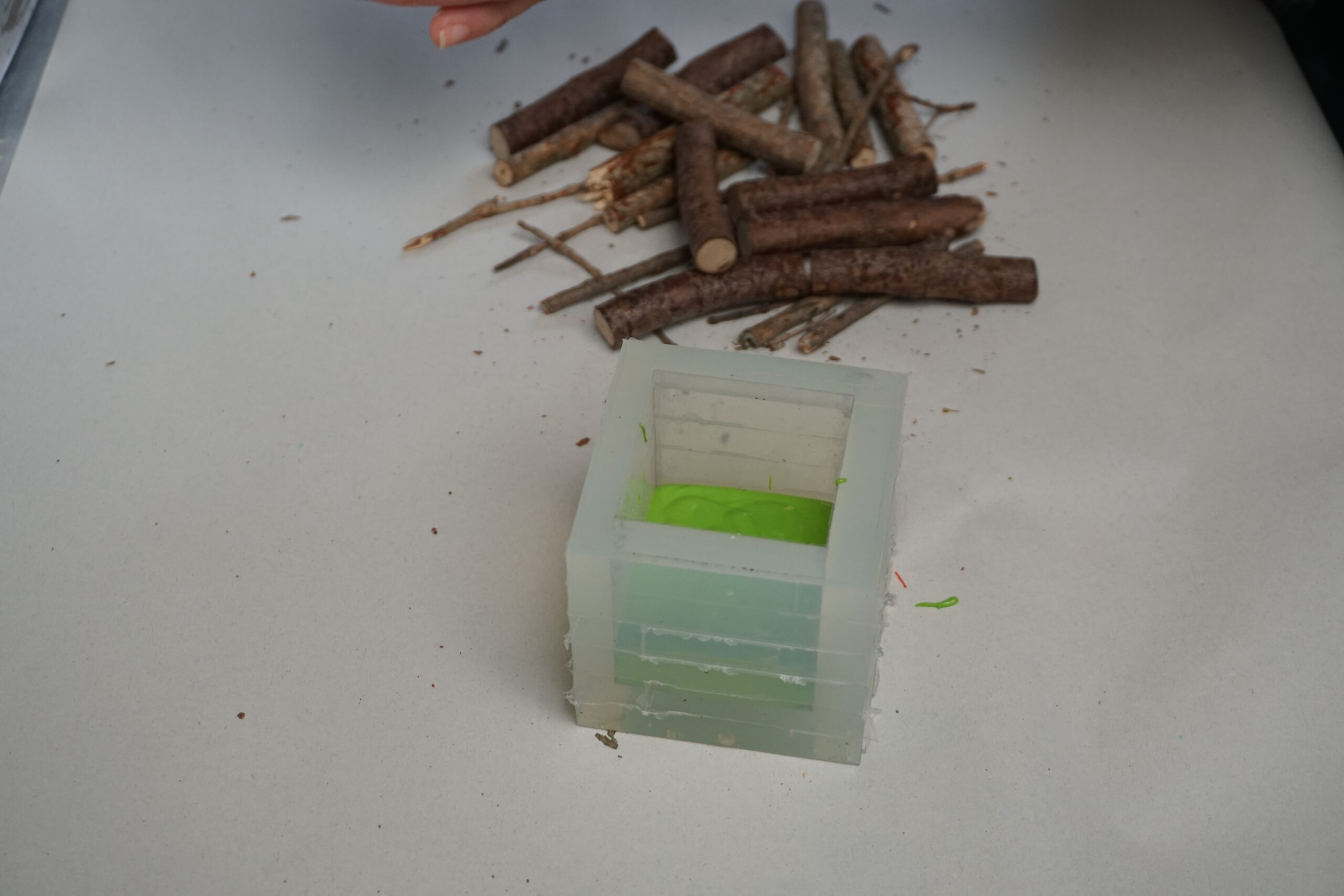 3.いったん枝を取り出し、型の4/1くらいまで着色したAC100を流し込んでおきます。