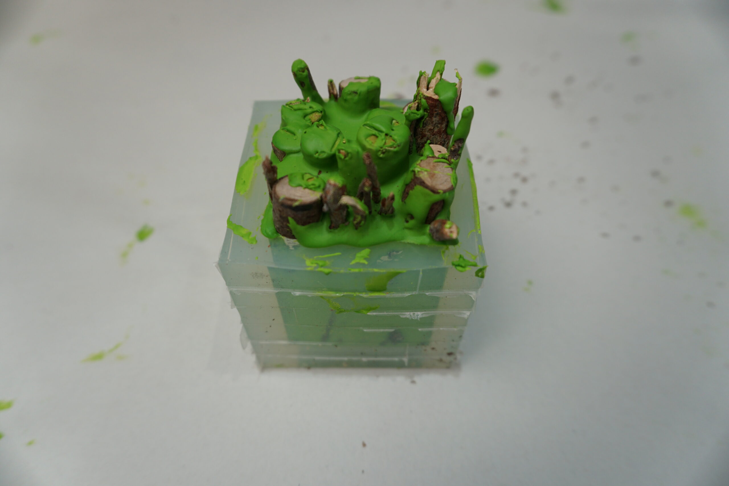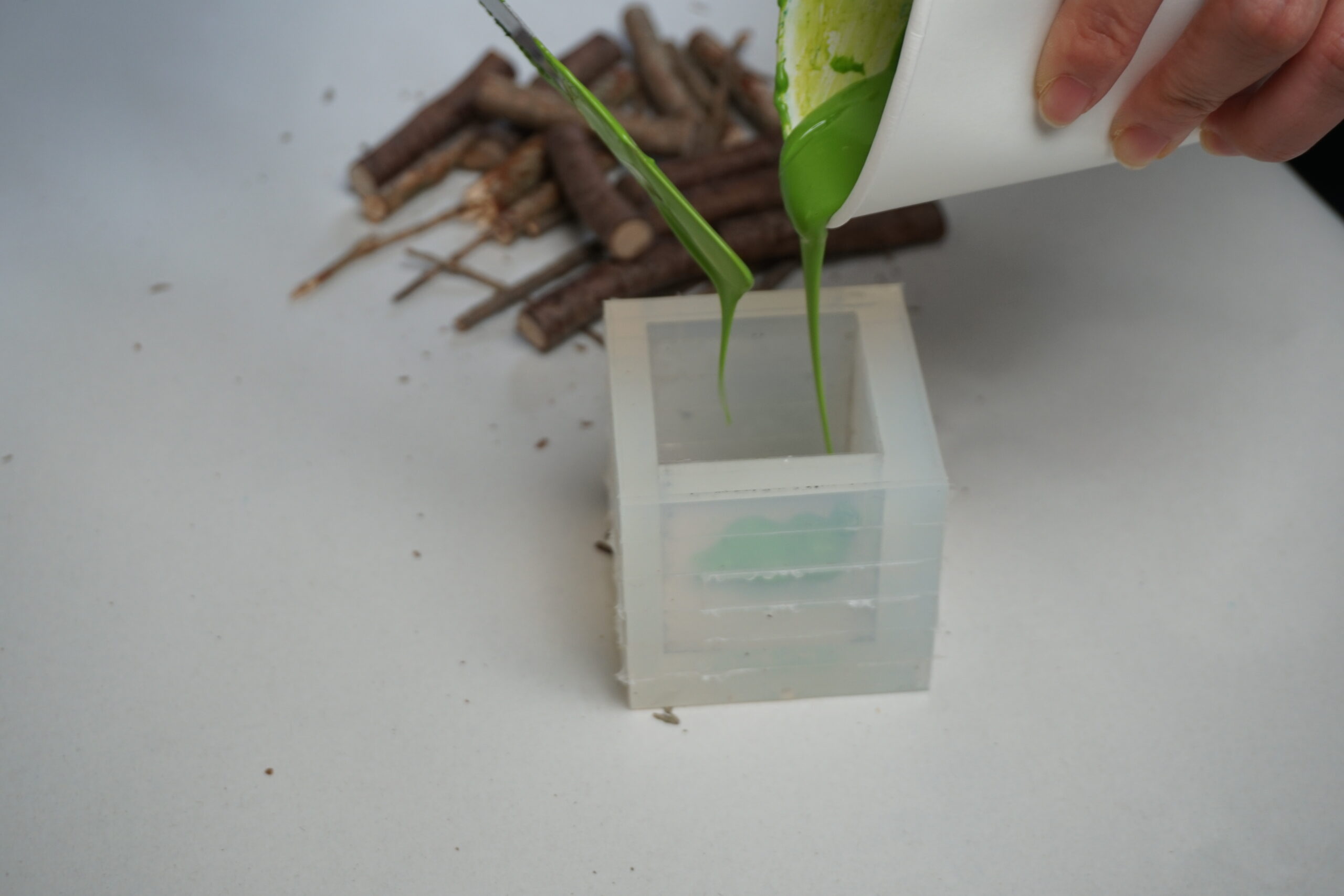 3.いったん枝を取り出し、型の4/1くらいまで着色したAC100を流し込んでおきます。