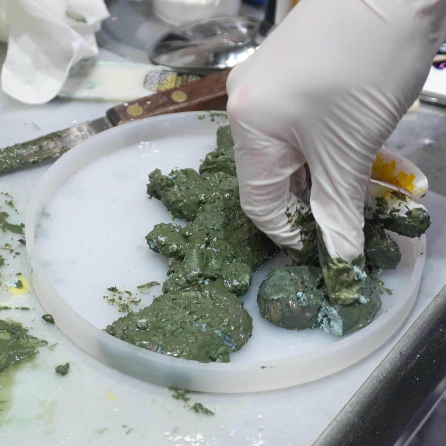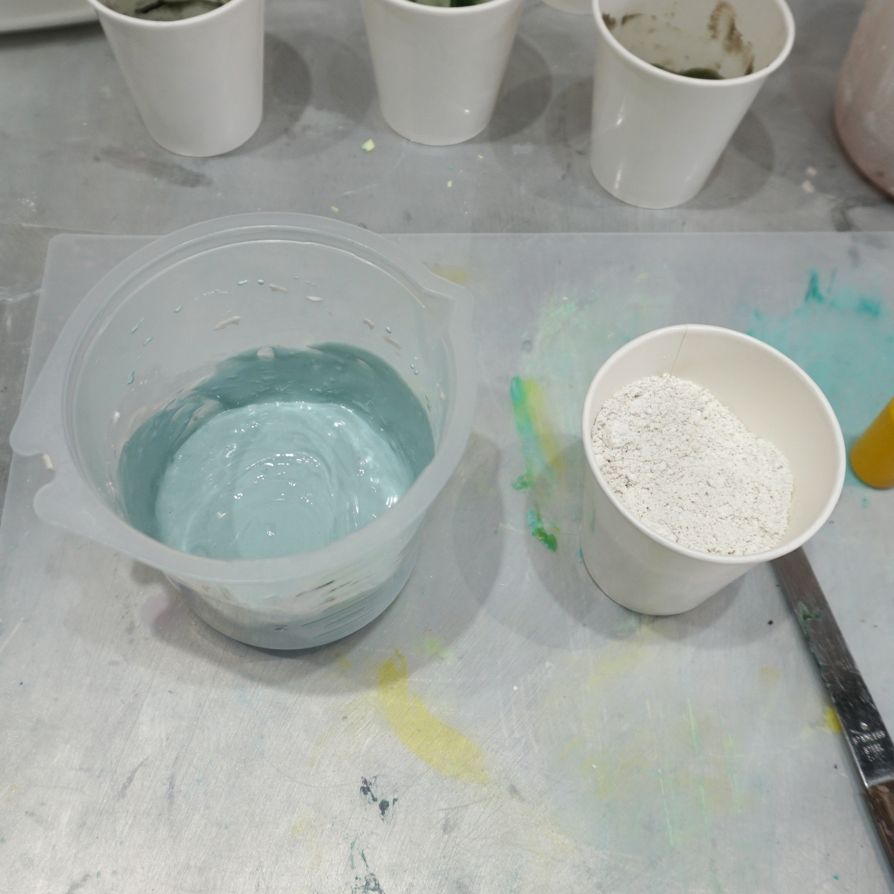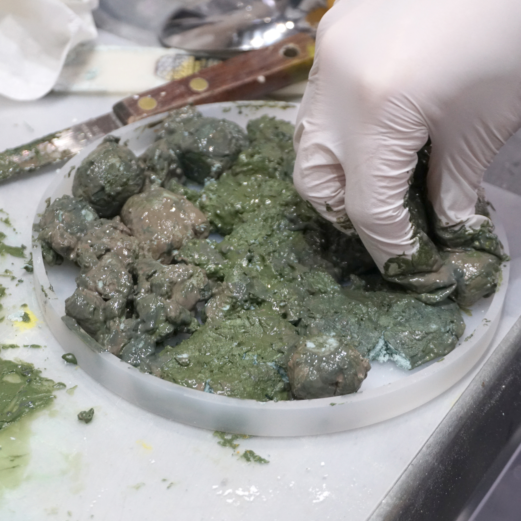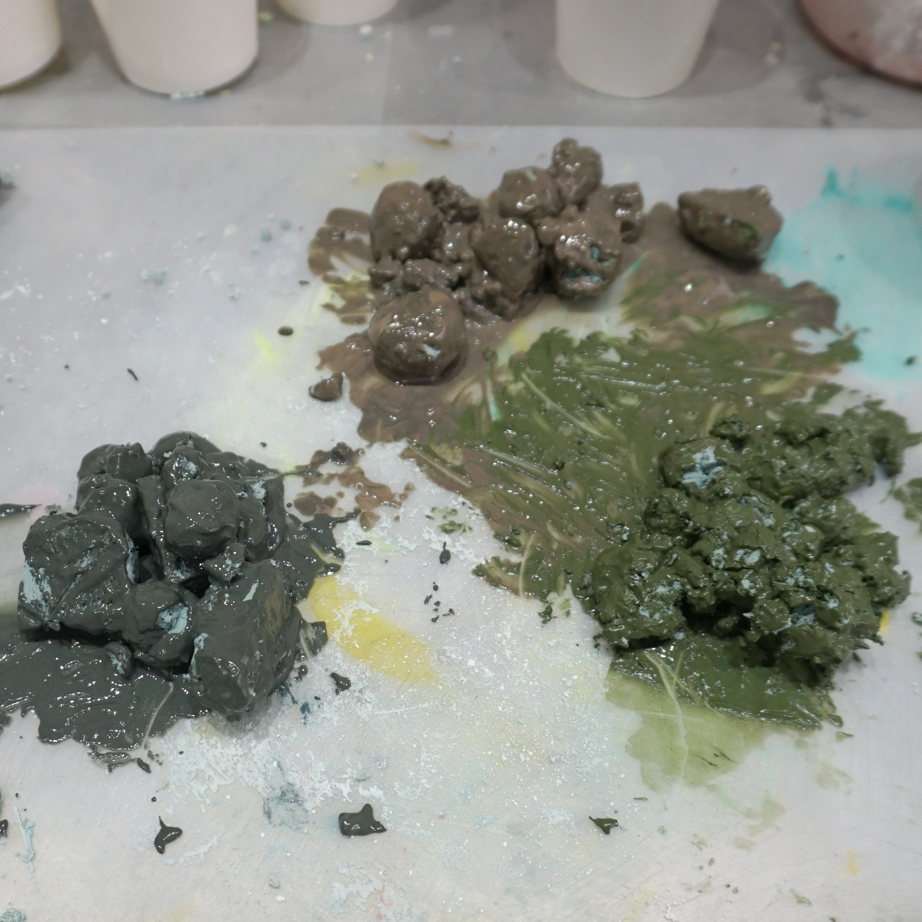 3.着色したAC100(50g×3=合計150g)をベースと混ぜ合わせます。これが先ほど作った小石の粒の”繋ぎ”になります。(完成した際に線として見えている部分です。)